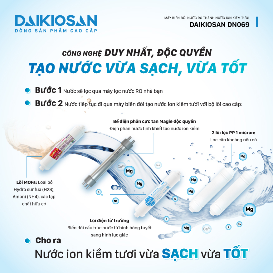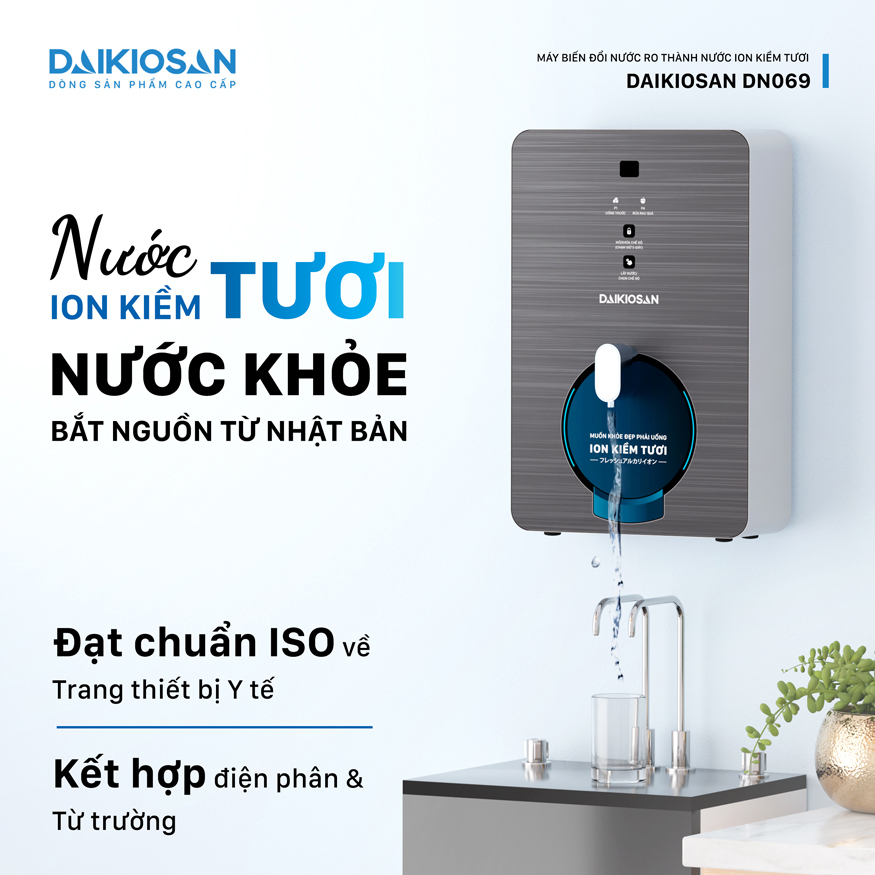 - Máy biến đổi nước RO thành nước Ion kiềm tươi - từ trường Daikiosan DN069 là chiếc máy biến đổi được nâng cấp và trang bị nhiều công nghệ hiện đại nhất trên thị trường, mang đến một nguồn nước tốt cho mọi nhà với giá cả vô cùng hợp lý.